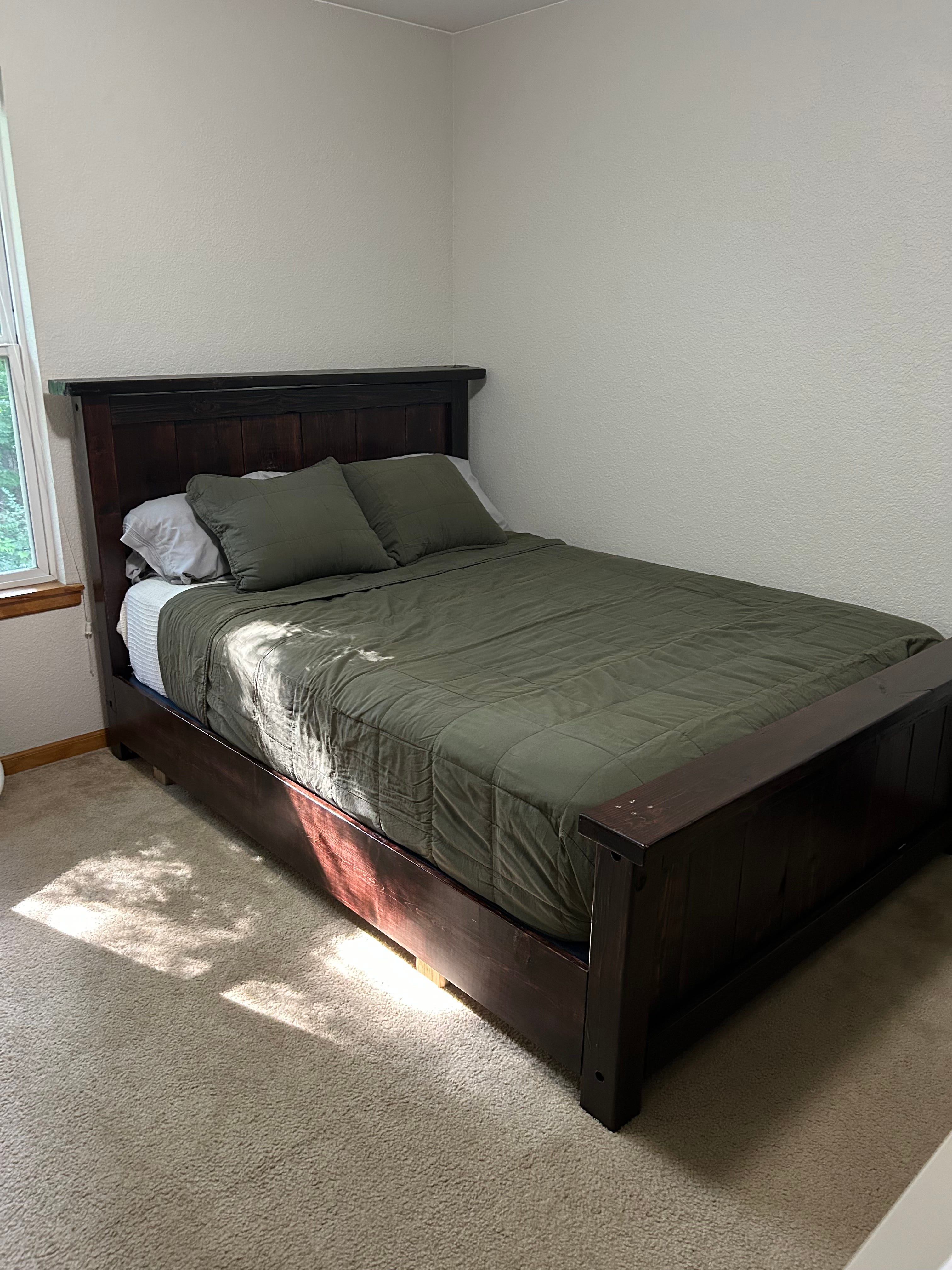 When a need arose for a new bedframe on a budget, rather than thinking I wonder where I can buy a bedframe. My first thought was how hard could it be to build a bedframe? Using recycled lumber, I took what was meant to be trash and gave it a new life. Biased as I am, I think that for my first bedframe, it turned out pretty good! By only purchasing stain, gloss, and three boards, the cost of a SOLID wood bedframe was a fraction of a brand-new solid wood frame.